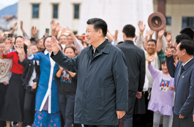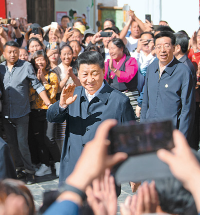 22日下午,习近平在考察位于拉萨市老城区的八廓街时,向各族群众挥手致意。 |